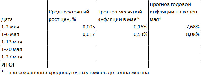 Инфляция в мае может составить 8,1%. Но пока эти оценки основаны на данных за первые 6 дней мая и могут быть ненадёжными.