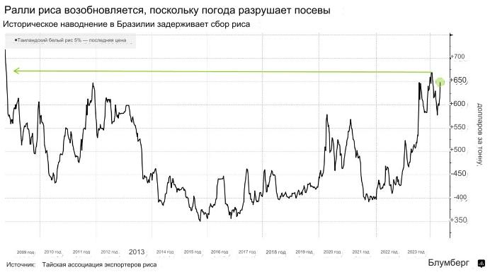 Поставки уже были подорваны масштабными экспортными ограничениями, введенными ведущим грузоотправителем Индией в прошлом году, и опасениями, что более сухая погода, вызванная Эль-Ниньо, приведет к сокращению производства в важном регионе выращивания риса - Юго-Восточной Азии. Теперь катастрофические наводнения на юге Бразилии усиливают тревогу.