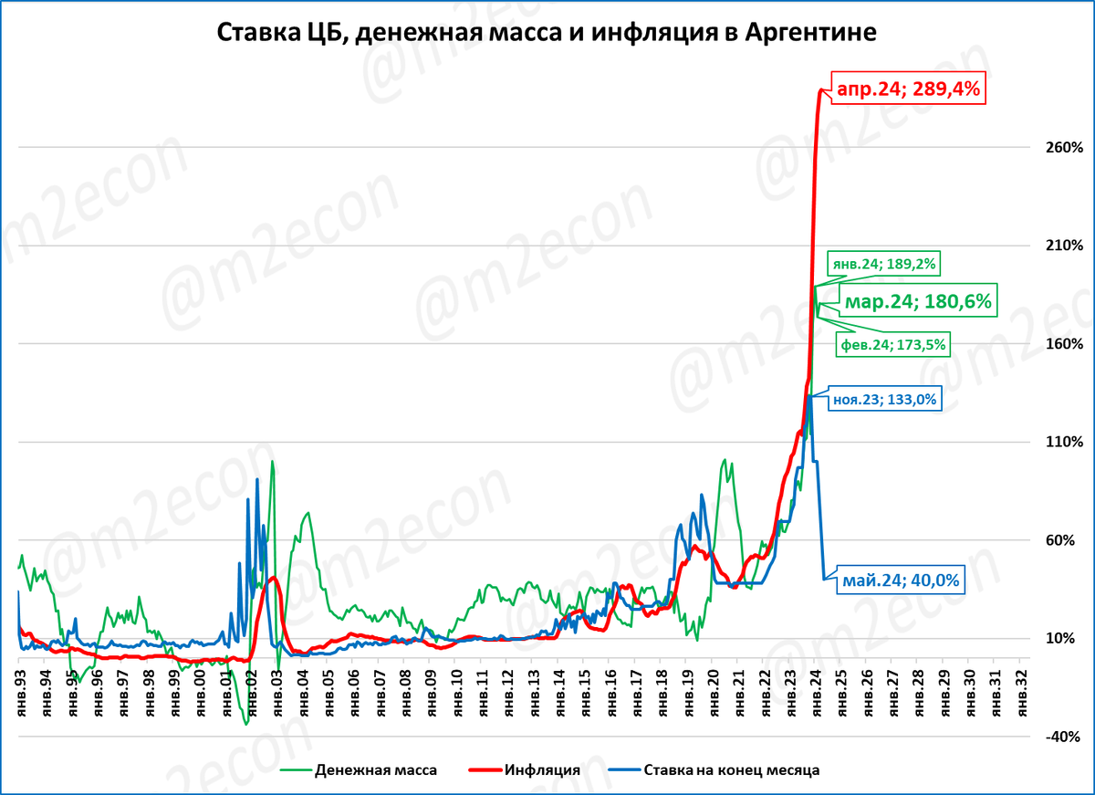 В Аргентине при инфляции 290% ЦБ снизил ставку до 40%. Это ошибка. ВВП Аргентины падал во 2-4 кварталах 2023 года.