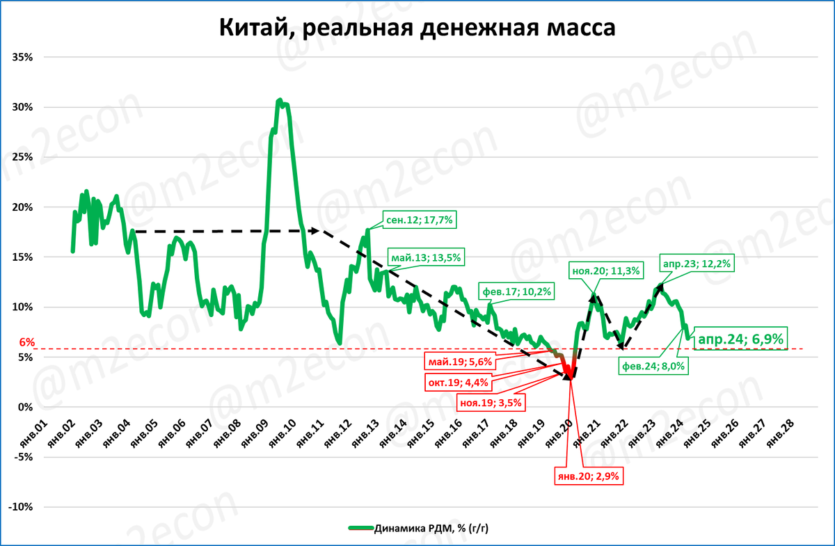 Темпы роста реальной денежной массы (РДМ) резко замедляются и приближаются к отметке 6% (красный пунктир на графике). Ниже этой отметки темпы опускались только в 2019-2020 годах (красные выноски на графике). Тогда причиной стал резкий взлёт инфляции из-за африканской чумы свиней (см. инфляцию на первом графике). Это вызвало рост цен на продовольствие в целом.