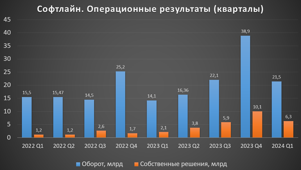 Оборот в 1Q 24 21,5 млрд (+52% г/г). Правда, результат на 81% ниже кв/кв, но это объясняется выраженной сезонностью бизнеса (основные продажи приходятся на второе полугодие). Рост оборота показывает, что Софтлайн перестроил продажи после ухода многих иностранных вендоров на российские IT компании.
