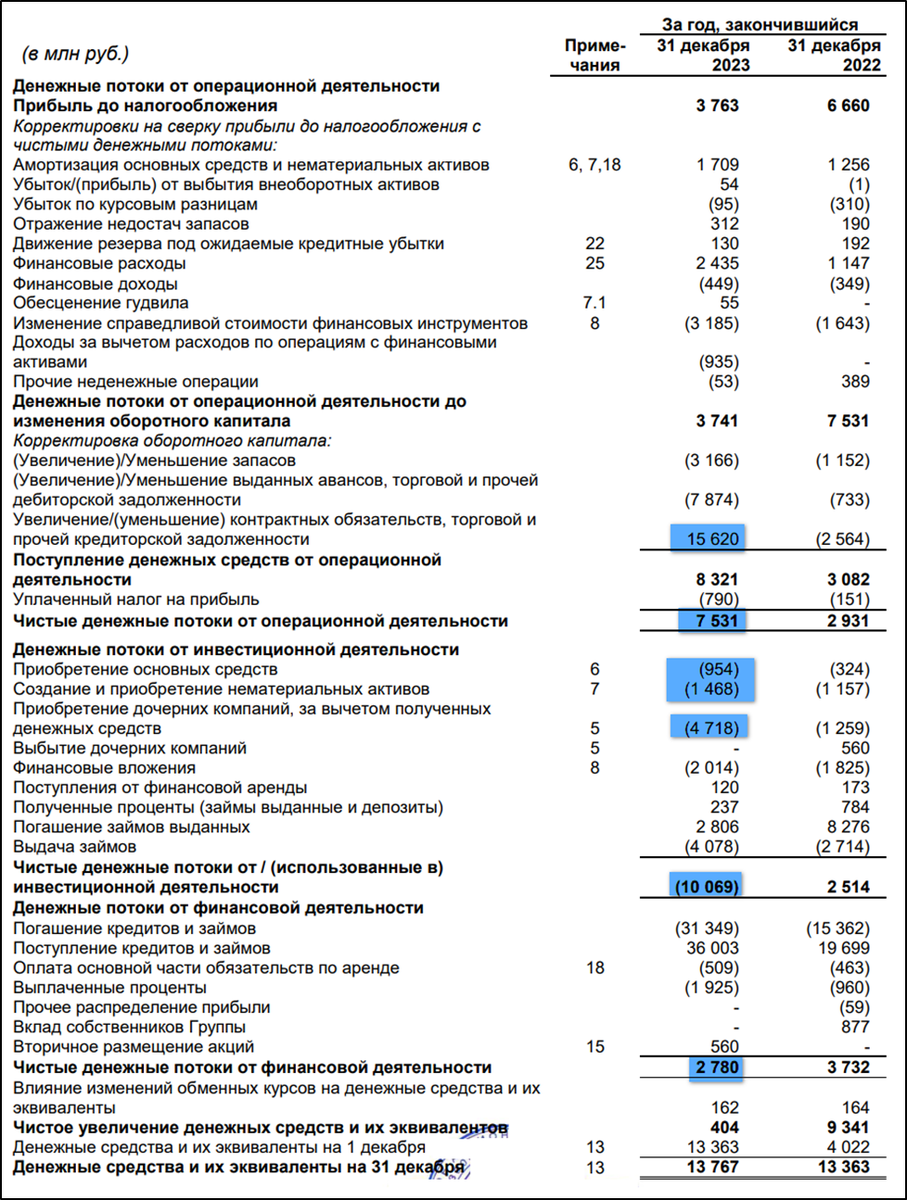 Денежные потоки 2023 рекордные за счет роста кредиторской задолженности.