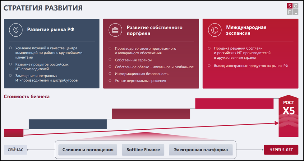 У Софтлайн есть стратегия развития, согласно которой ожидается рост бизнеса в 5 раз за 5 лет.