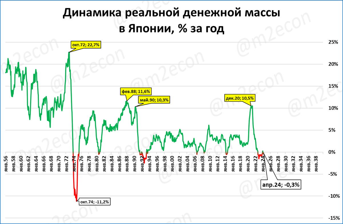 Япония: по предварительной оценке, ВВП в 1 квартале упал на 0,2%. Это первое падение после 11 кварталов роста подряд. Реальная денежная масса с 2022 года сжимается, но небольшими темпами.