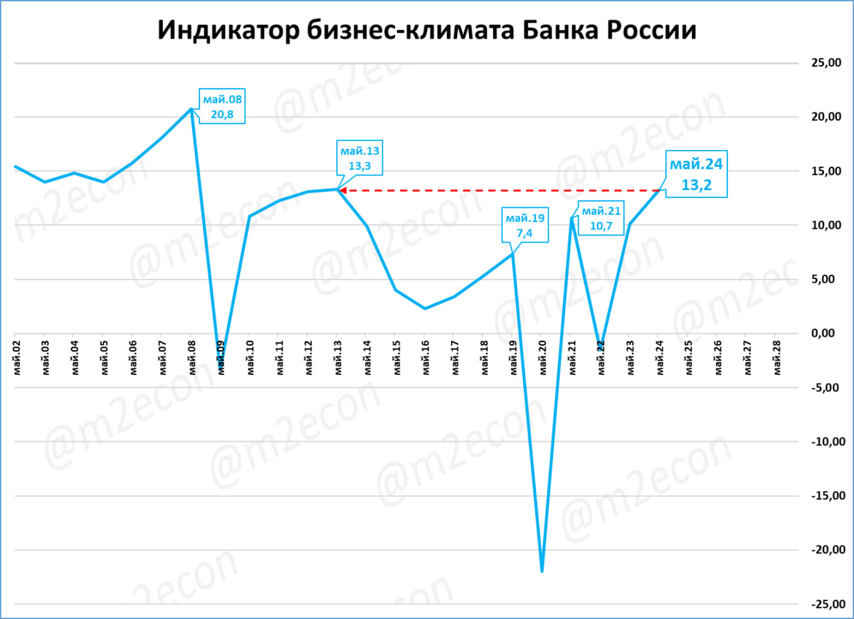 Индикатор бизнес-климата ЦБ в мае вырос до 13,2 пункта. Это лучший май с 2013 года и второй лучший май с 2008 года (за 16 лет).