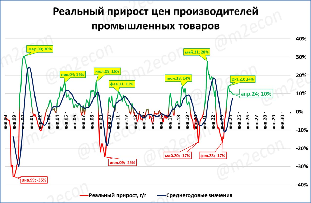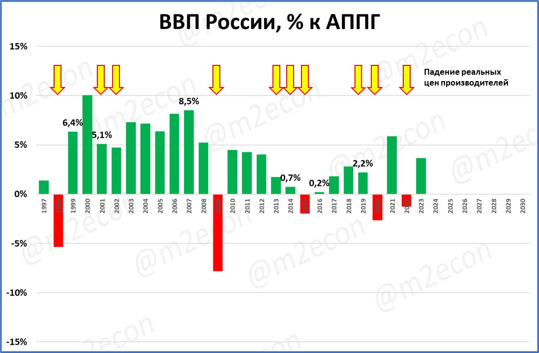 Обратите внимание: падение реальных цен производителей (красные столбики на графике выше) соответствует либо кризисам (1998, 2009, 2015, 2020, 2022), либо серьёзным замедлениям роста ВВП (2001, 2002, 2013, 2014, 2019).