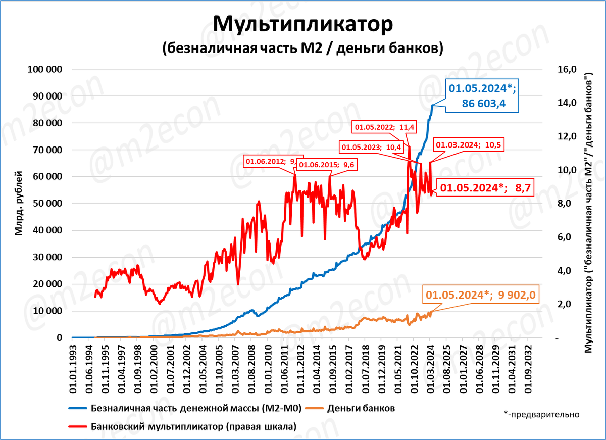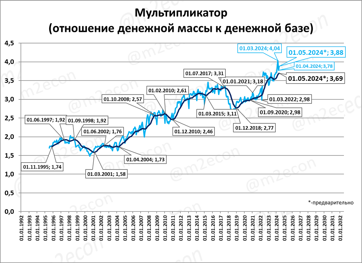 В марте 2024 года денежный мультипликатор установил исторический рекорд (4,04).