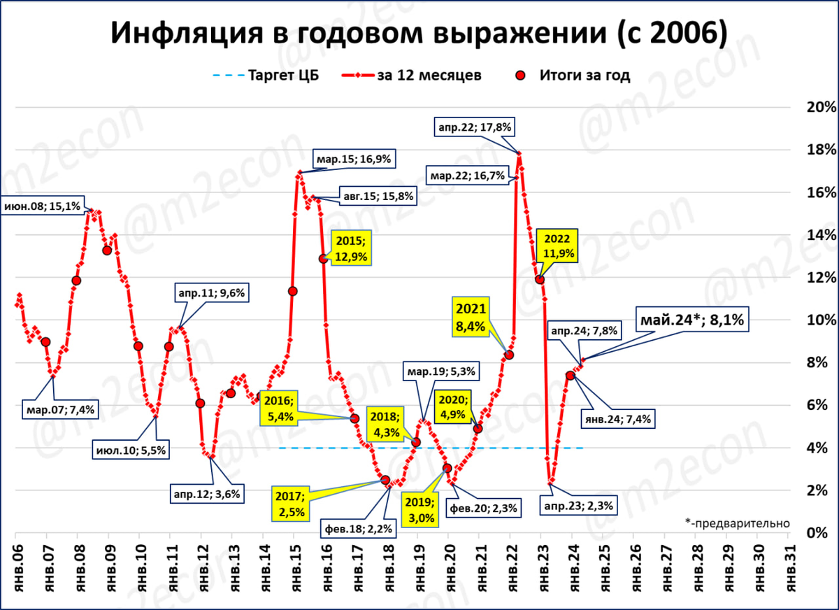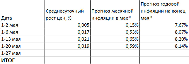 Если такой темп сохранится до конца месяца, то по итогам мая годовая инфляция вырастет до 8,1%.