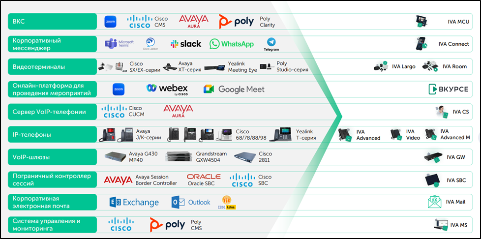 В экосистеме есть 14 продуктов, которые способны замещать решения уходящих западных компаний, в частности ZOOM, Microsoft Teams, CISCO и т.п. По данным Market CNews, флагманский продукт IVA MСU — лидер среди российских решений для корпоративной связи.