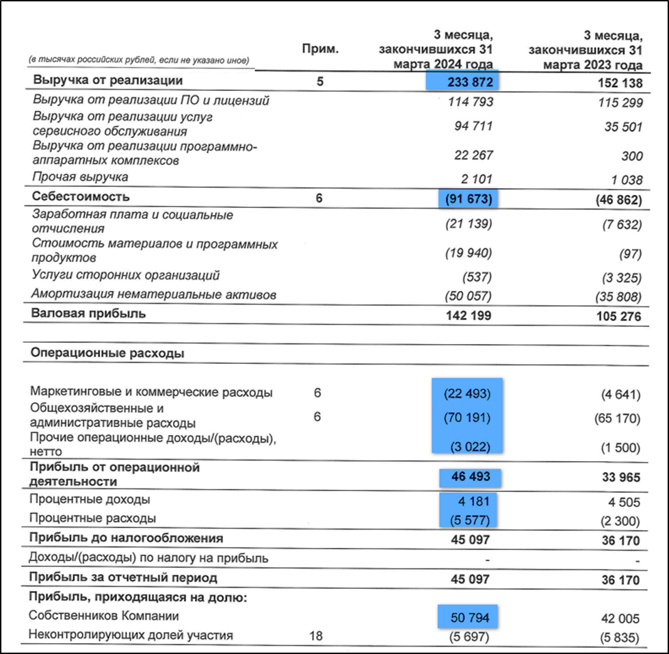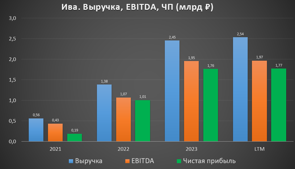 Других квартальных данных нет, поэтому посмотрим на диаграмму результатов на годовом горизонте. Очевидно, что бизнес быстро растущий. Средние темпы роста выручки в 2021-2023 годах 110%, а EBITDA 139%. На диаграмме также приведены данные LTM (за последние 12 месяцев), которые не сильно превышают показатели 2023 года, это объясняется сезонностью, - основные продажи приходятся на второе полугодие, также как в других компаниях IT сектора (Позитив, Астра, Софтлафн и др.).