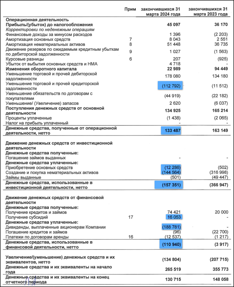 инвестиционная деятельность -0,157 млрд (-57% г/г). Почти всё приходится на капитальные расходы, в частности, создание ПО. К слову, на эти цели ушло в 2 раза меньше денег, чем годом ранее.