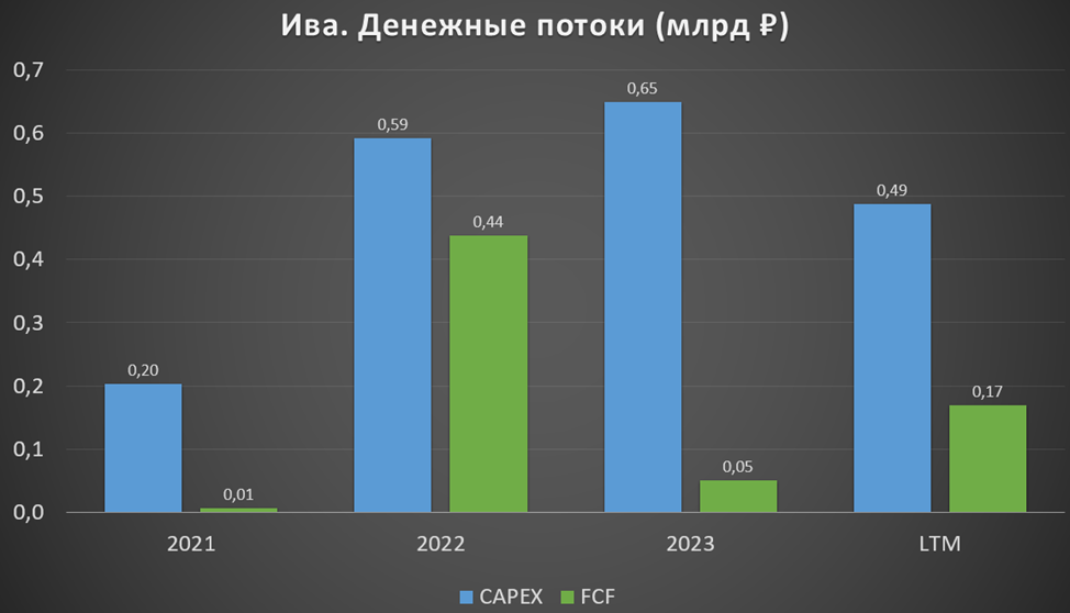 Свободный денежный поток (FCF) за 1Q 24 в районе ноля, но FCF LTM = 0,17 млрд