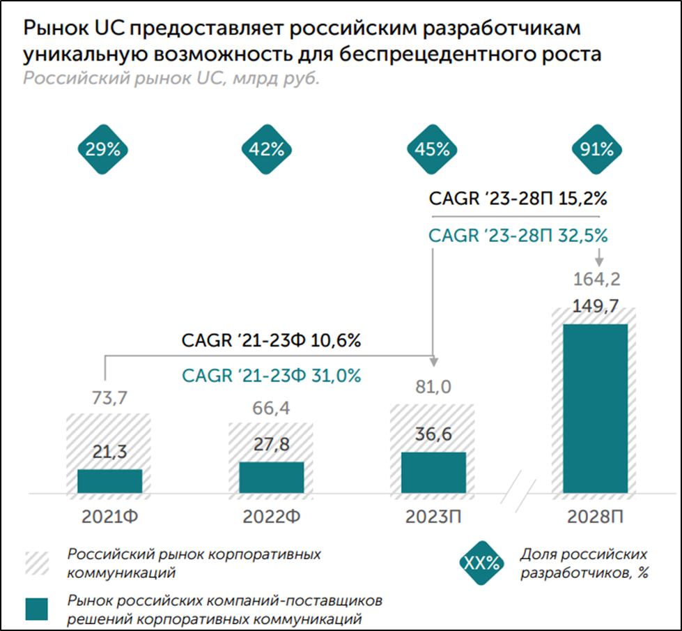 Перспективы связаны с продолжением роста рынка корпоративных коммуникаций в РФ. Ориентировочные темпы роста российских поставщиков 32%.