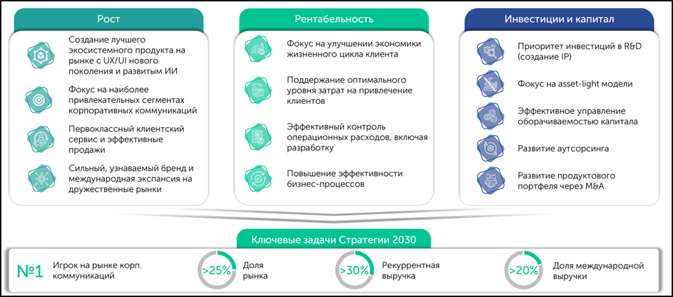 Стратегия 2030 компании предусматривает сохранение лидирующих позиций на рынке корпоративных коммуникаций с долей 25%. 30% выручки планируется получать по подписочным сервисам. Также ИВА рассчитывает, что к 2030г. доля международной выручки должна превысить 20%.