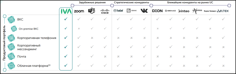 ИВА заявляет, что у них наиболее сильное продуктовое предложение по сравнению с конкурентами. Плюс они активно внедряют решения на основе ИИ: автоматический синхроперевод, стенография и т.п. Но очевидно, что это не такие уж сложные и дорогие решения, такие компании, как VK, Сбер, Яндекс и многие другие способны быстро при необходимости внедрить подобный функционал.