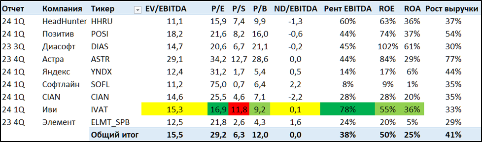 При проведении IPO по верхней границе капитализация составит 30 млрд. Мультипликаторы, конечно, не низкие. Но относительно конкурентов из IT отрасли, ИВА оценена в целом адекватно. Отдельно отмечу супер рентабельность по EBITDA 78%.