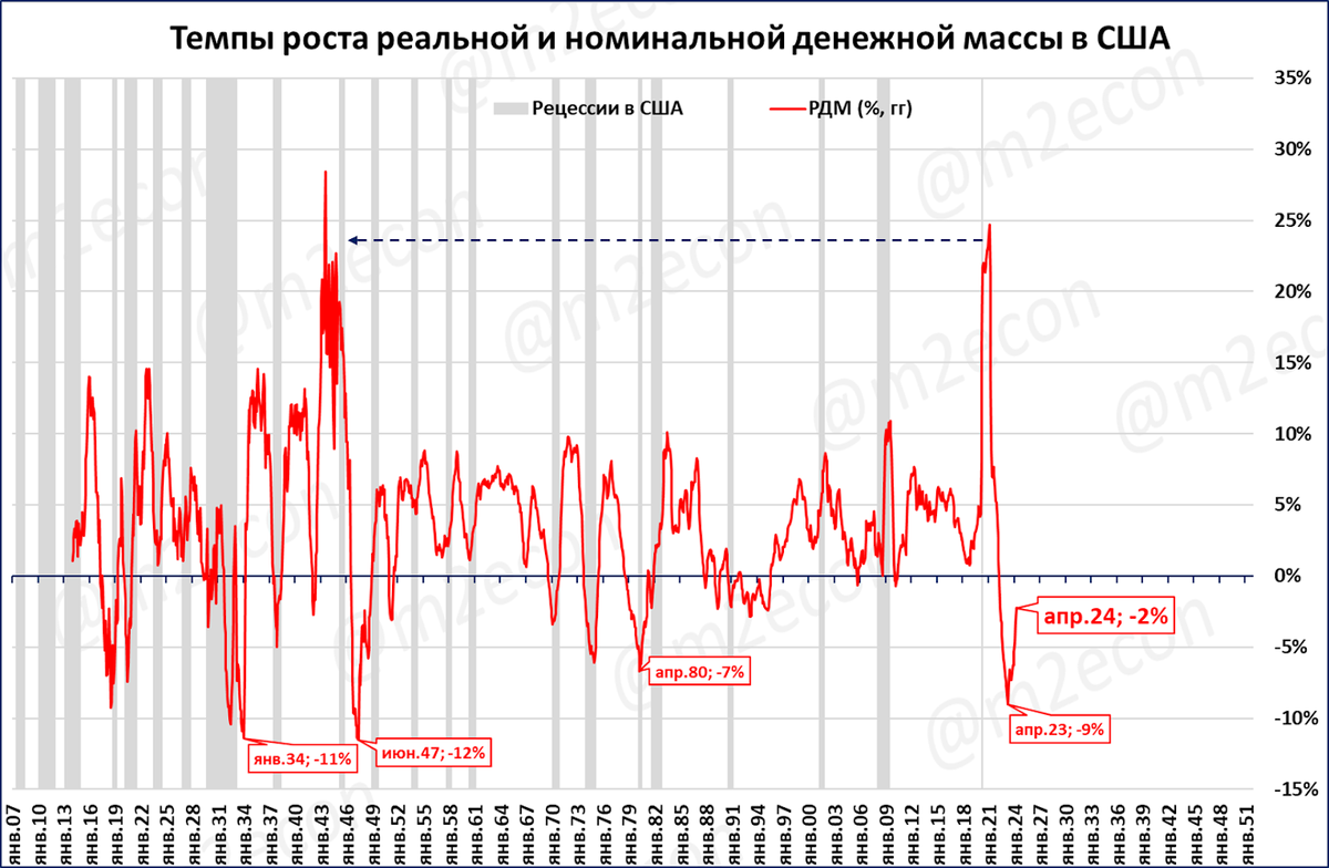 Обратите внимание: падению ДМ и РДМ предшествовал их феноменальный рост, рекордный со времён Второй мировой войны (пунктирные стрелки на графиках).