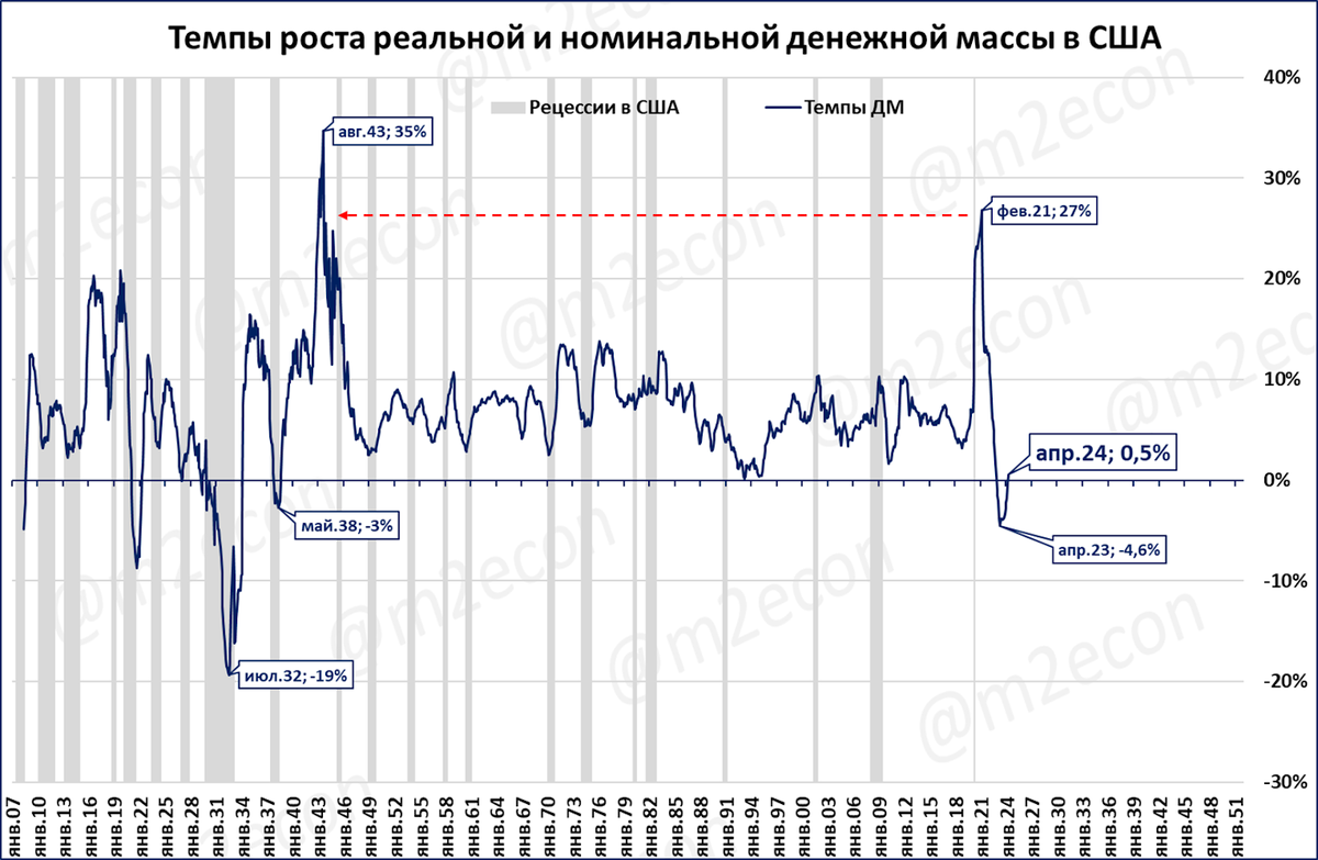 Одно из возможных объяснений: экономика движется на “топливе” денежного смягчения 2020-21 годов. Похоже, не падать экономике США помогает тот факт, что падение РДМ (и ДМ) происходит после самого быстрого роста с 1940-х годов (т.е. со времён Второй мировой войны). Мы обратили ваше внимание на этот факт в предыдущем сюжете.