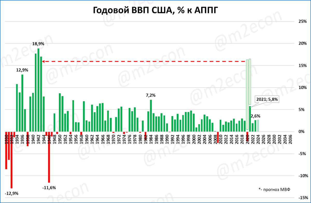 Наглядно: рост ВВП в 2020 и 2021 годах мог бы быть сопоставимым с ростом ВВП в 1942-44 годах, когда он превышал 15%. На графике ниже такой потенциал роста ВВП обозначен светло-зелёными столбиками в 2020 и 2021 годах.
