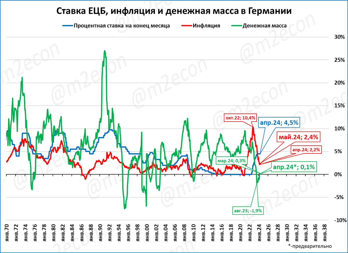 Инфляция в Германии по итогам мая выросла до 2,4%. Падение денежной массы прекратилось. По предварительным данным в апреле она выросла на 0,1%.