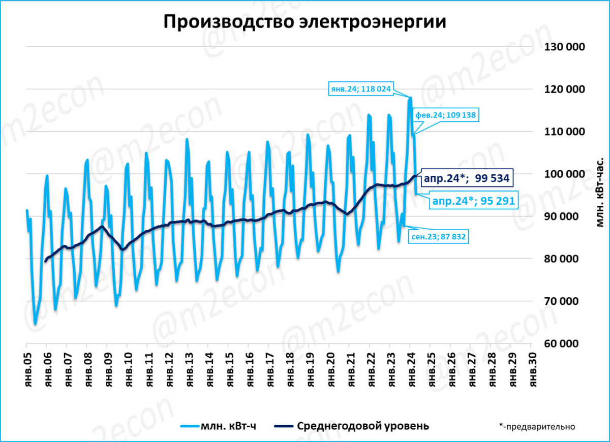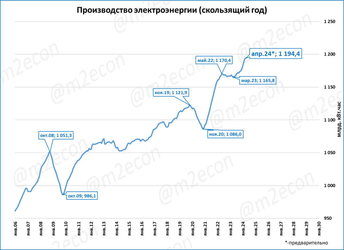За 12 месяцев (скользящий год) было произведено 1,194 трлн кВт-часов электроэнергии - это новый исторический рекорд.