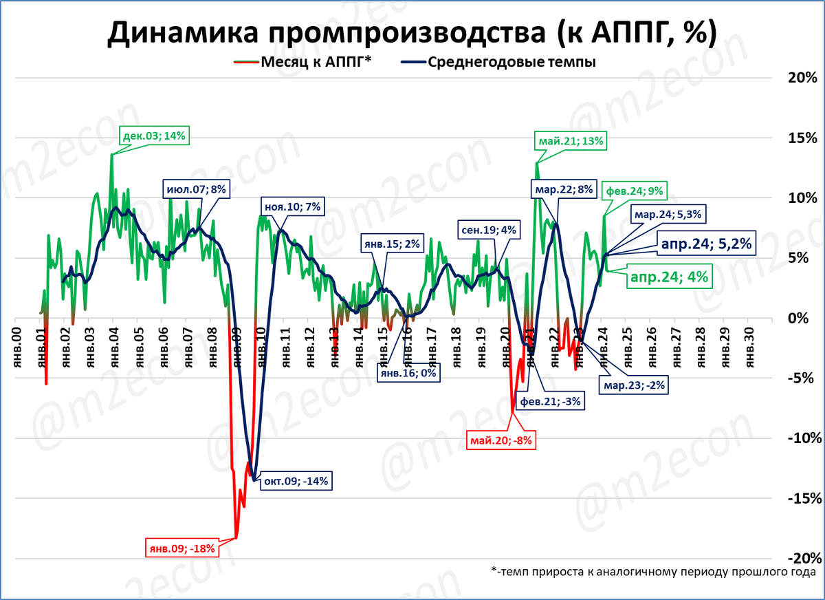 Оценка: промпроизводство – это примерно 30-32% ВВП России. Его рост в апреле даёт сигнал о продолжении роста ВВП во 2 квартале 2024 года хорошими темпами.