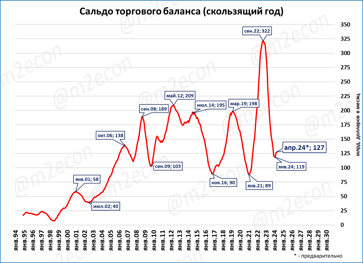 Сальдо за последние 12 месяцев (скользящий год) составило 127 млрд. долларов.