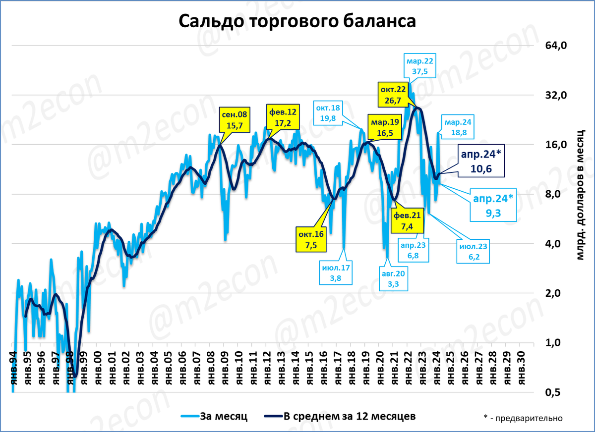 Сальдо торгового баланса России сохраняется положительным: в апреле 9,3 млрд. долларов. Рост к апрелю прошлого годам составил 37%. Рост сальдо наблюдается третий месяц подряд.