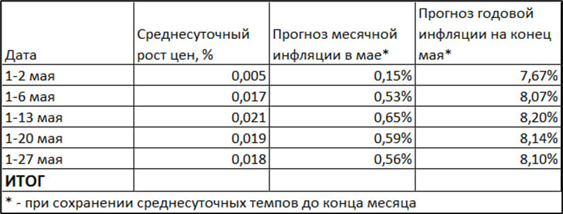 Если такой темп сохранится до конца месяца, то по итогам мая годовая инфляция вырастет до 8,1%.