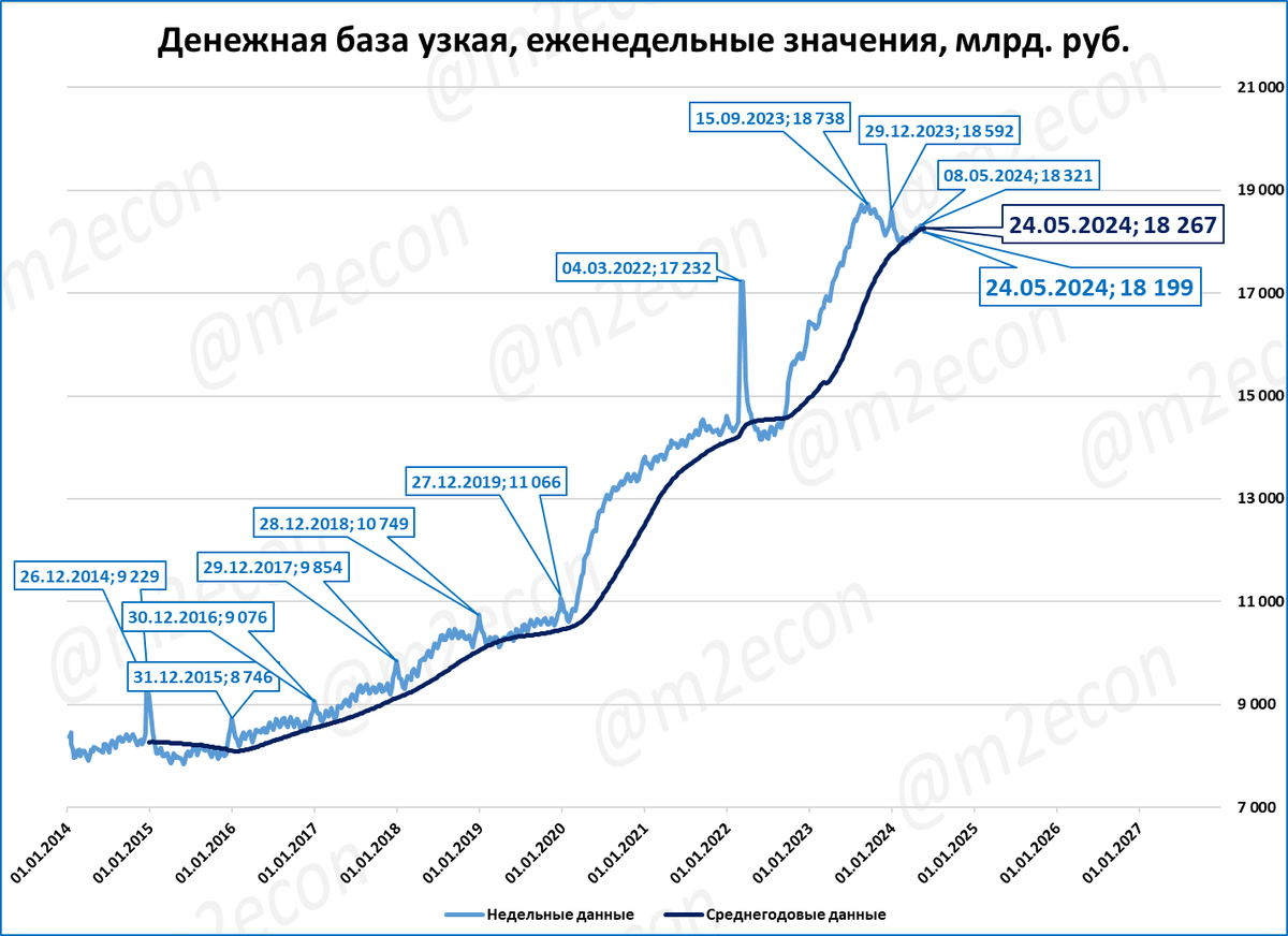 По данным ЦБ, узкая денежная база на 24 мая составила 18,2 трлн рублей.