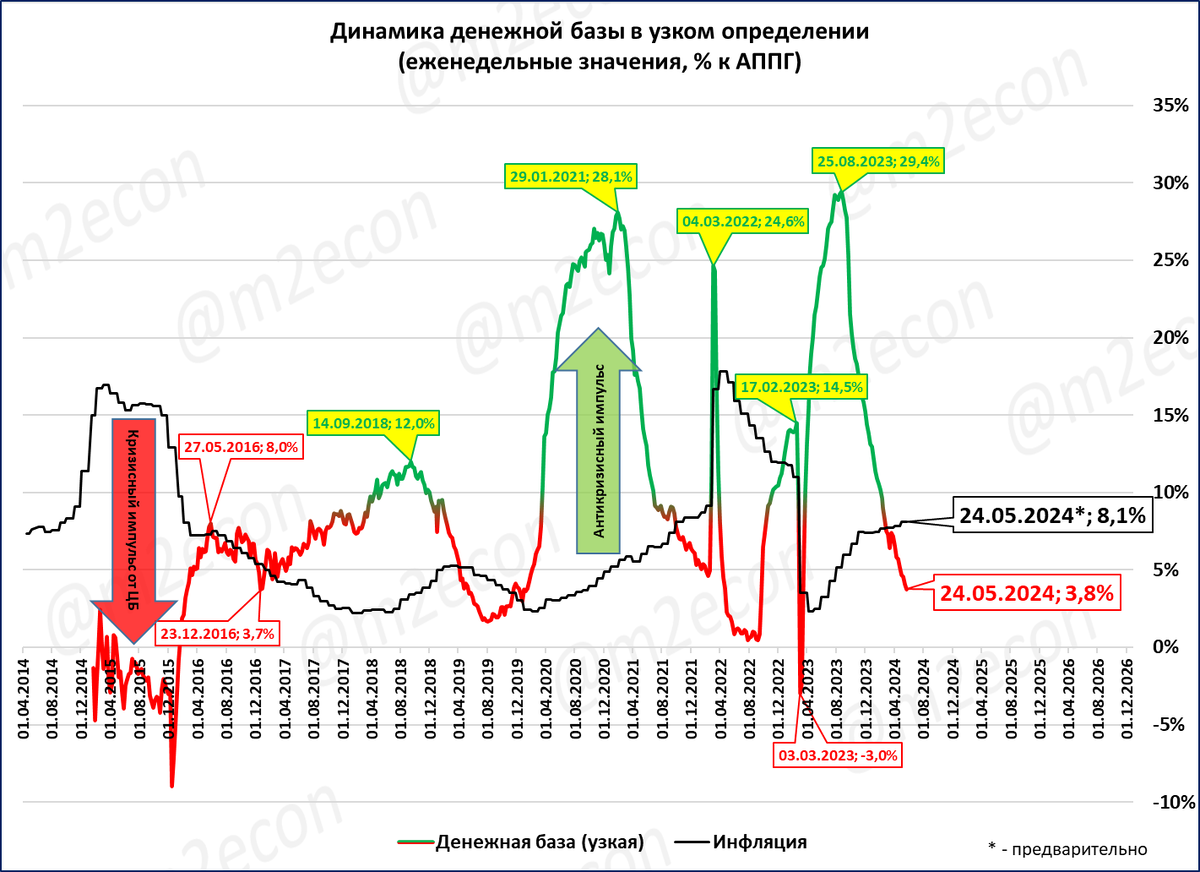 Рост узкой денежной базы всё сильнее отстаёт от роста цен. Показатель сжимается в реальном выражении.