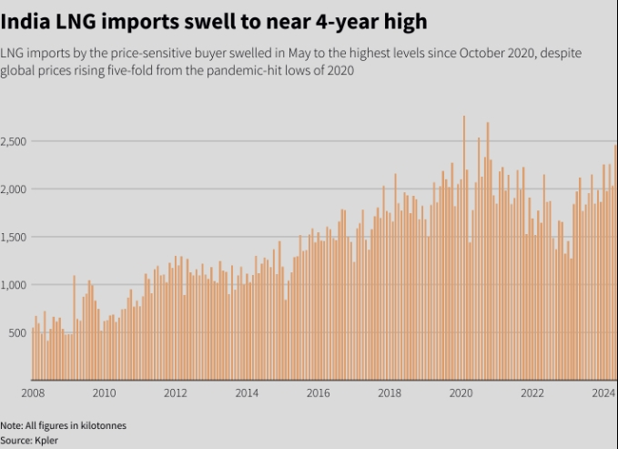 Чтобы удовлетворить этот спрос, импорт СПГ увеличился в мае до самого высокого уровня с октября 2020 года, как показали данные аналитических компаний LSEG и Kpler, несмотря на то, что мировые цены выросли в пять раз по сравнению с минимумами 2020 года (эффект пандемии).