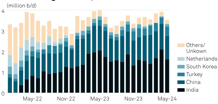 Наибольшее падение экспорта сырой нефти произошло на маршруте в Индию, как показывают данные: сокращение почти на 700 000 б/с за месяц до трехмесячного минимума в 1,61 миллиона б/с в мае. В апреле экспорт российской нефти в Индию вырос до рекордных 2,1 млн б/с, что является самым высоким показателем с тех пор, как Индия стала для России крупнейшим покупателем ее нефти. Скачок объемов произошел после разрешения спора о валютных платежах с Москвой и попыток России обойти санкции в отношении экспорта нефти, из-за которых ранее индийские нефтеперерабатывающие заводы избегали российского танкерного флота «Совкомфлота».