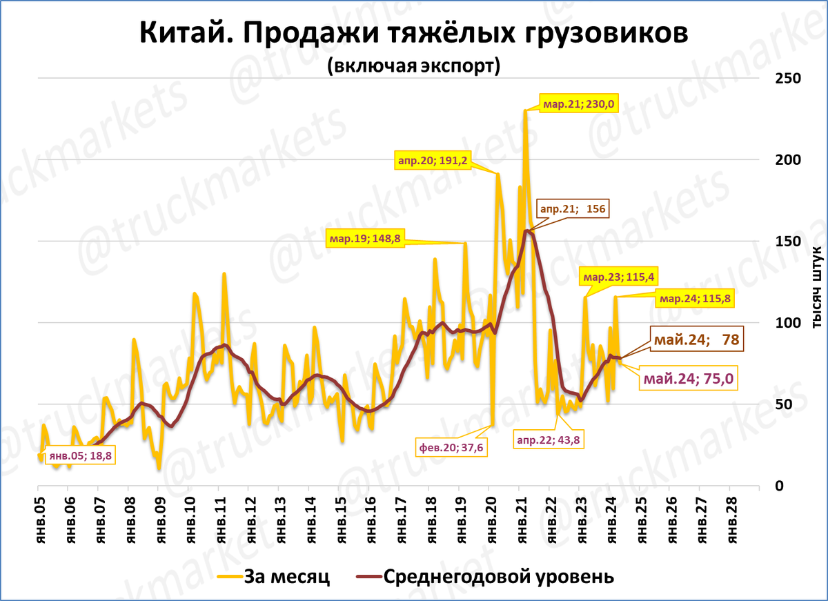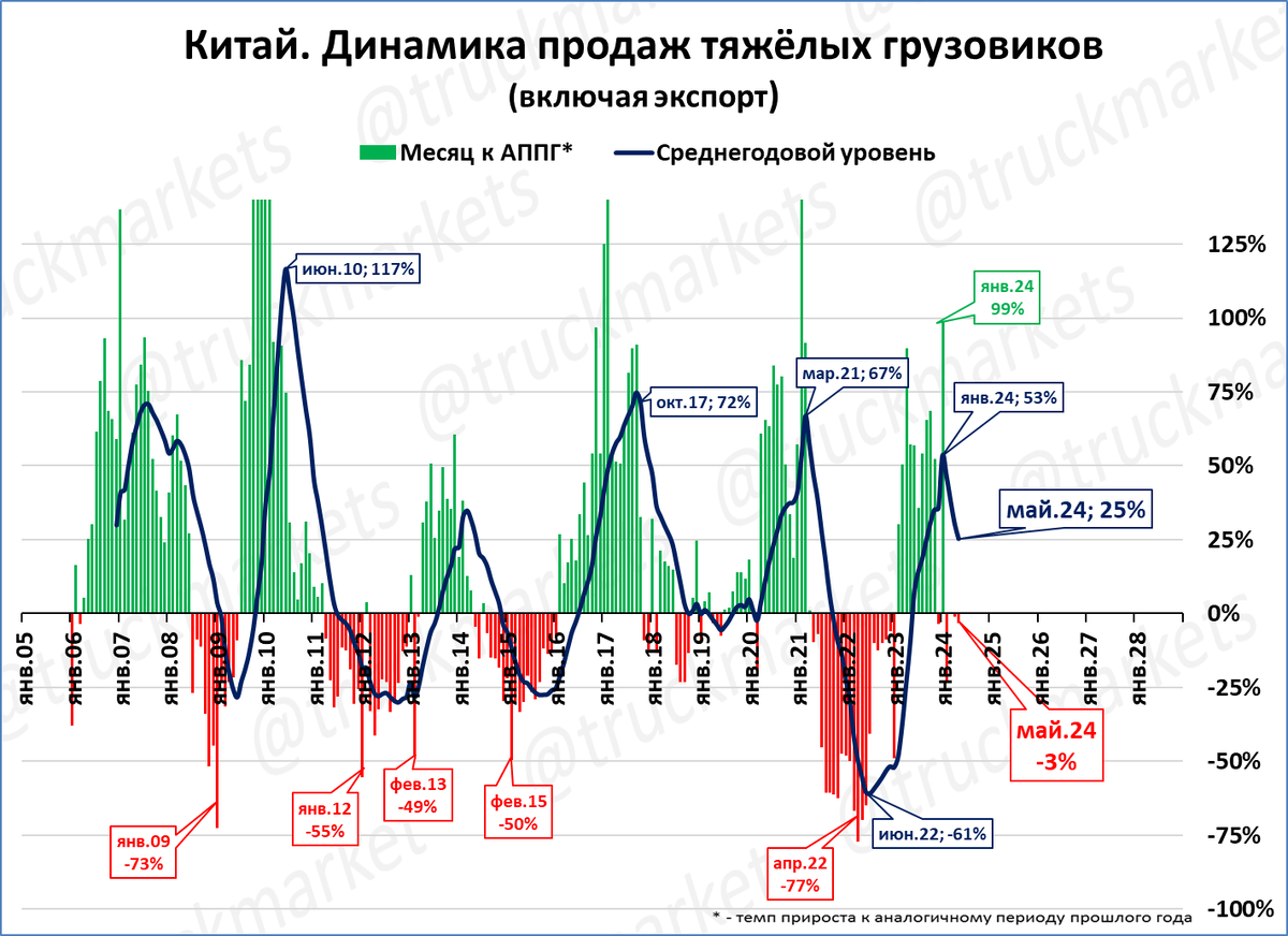 Продажи грузовиков китайскими производителями (экспорт + внутренний рынок) падают второй месяц подряд. Падение в мае составило -3%.