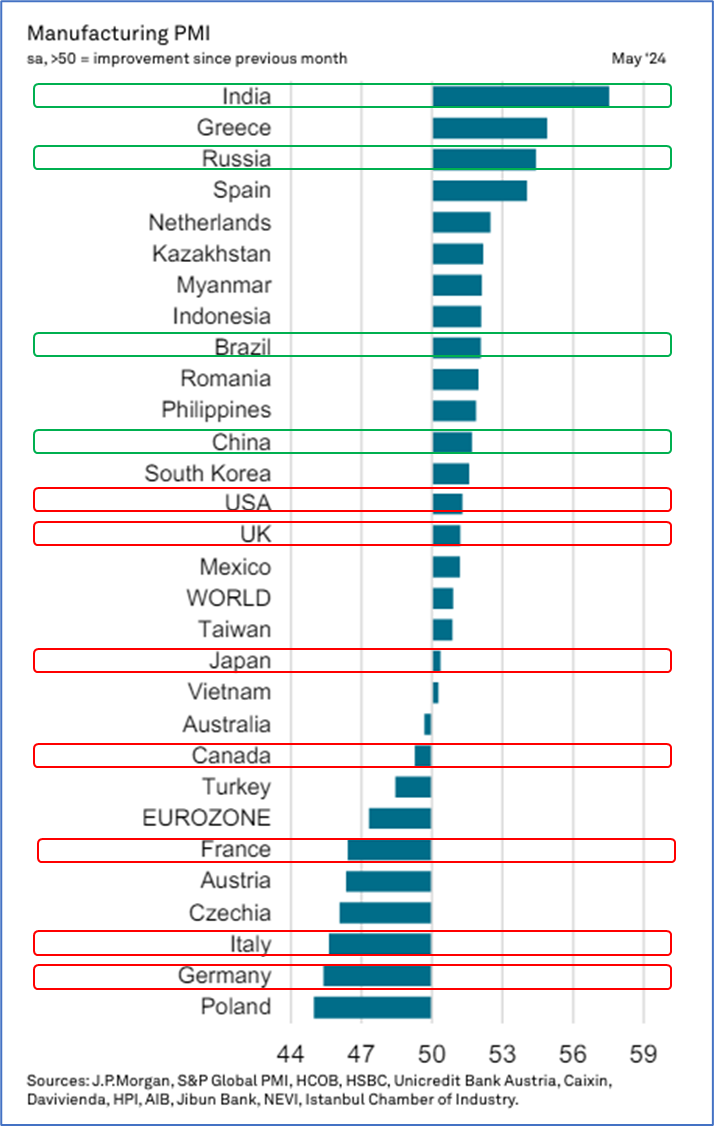 При сравнении динамики индекса PMI в производственном секторе между странами БРИК (Бразилия, Россия, Индия, Китай) и странами "Большой семерки" (G7, представляющими коллективный Запад), очевидно преимущество группы стран БРИК (см. график ниже).