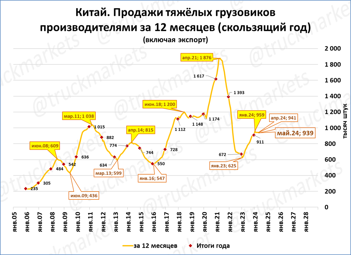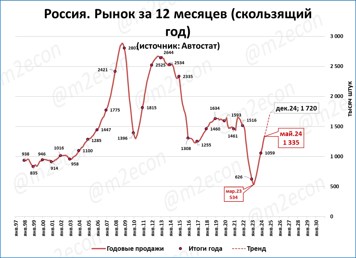 За 12 месяцев (скользящий год) продажи составили 939 тыс. Это больше итогов 2023 года, но чуть ниже пика, показанного по итогам января.
