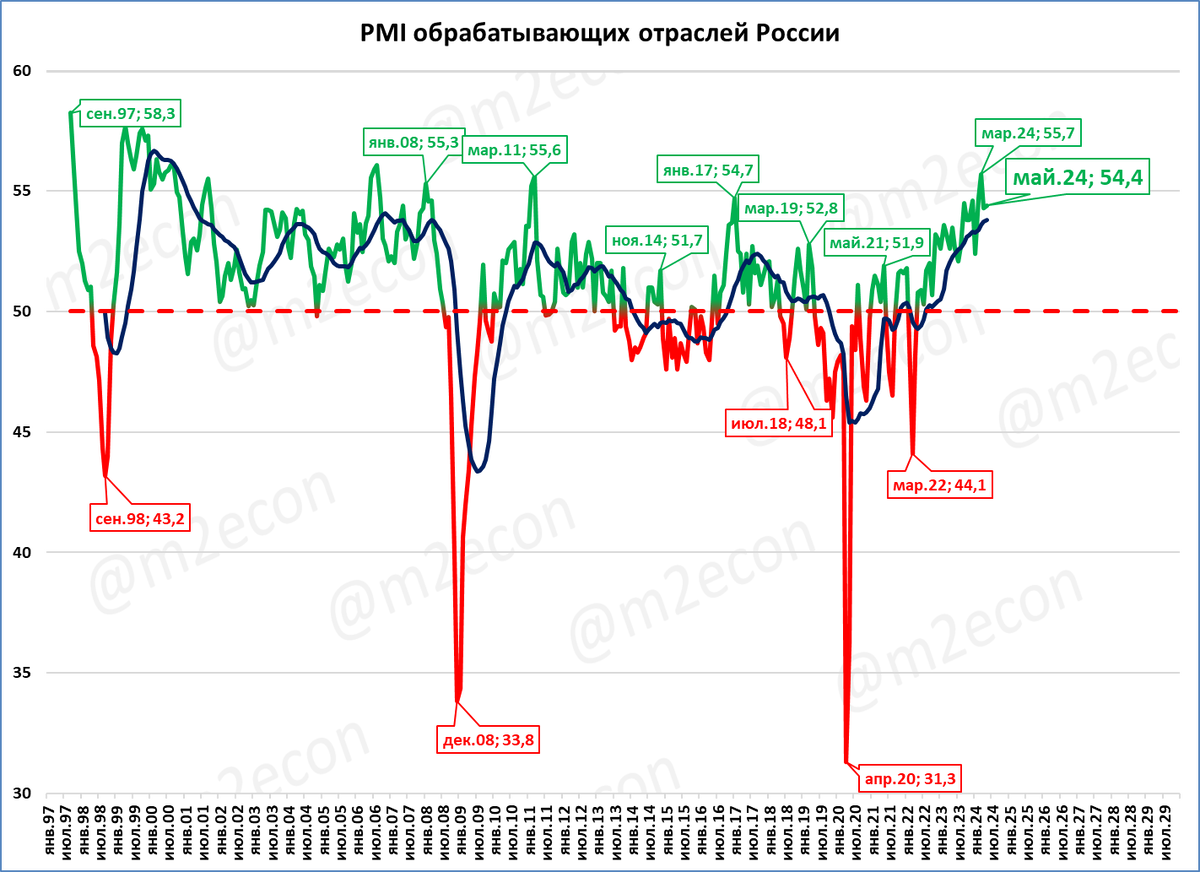 Индекс деловой активности в промышленности России (PMI manufacturing) продолжает ставить рекорды. Напомним, что индекс выше 50 пунктов означает рост, а ниже 50 пунктов — снижение деловой активности.