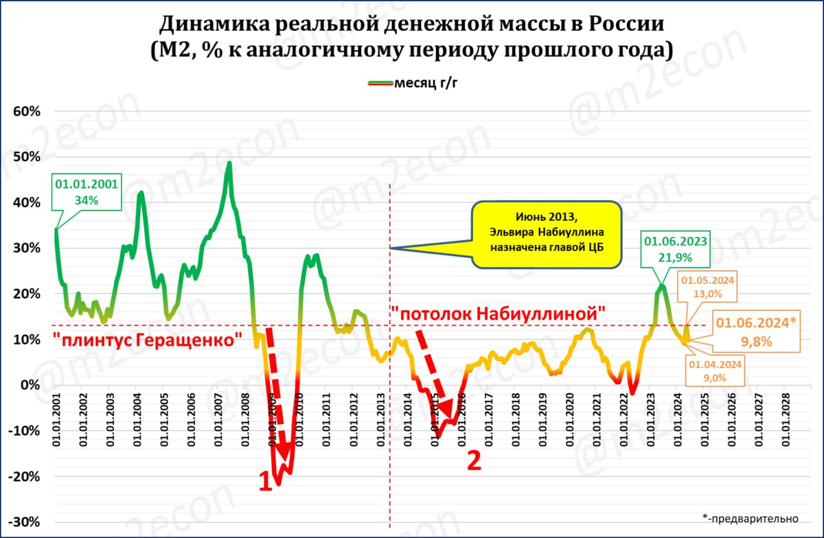 Набиуллина вернулась под свой потолок. Или, по-другому, она вновь опустила рост денежной массы "ниже плинтуса", ниже которого в 2000-2008 годах реальная денежная масса не опускалась.