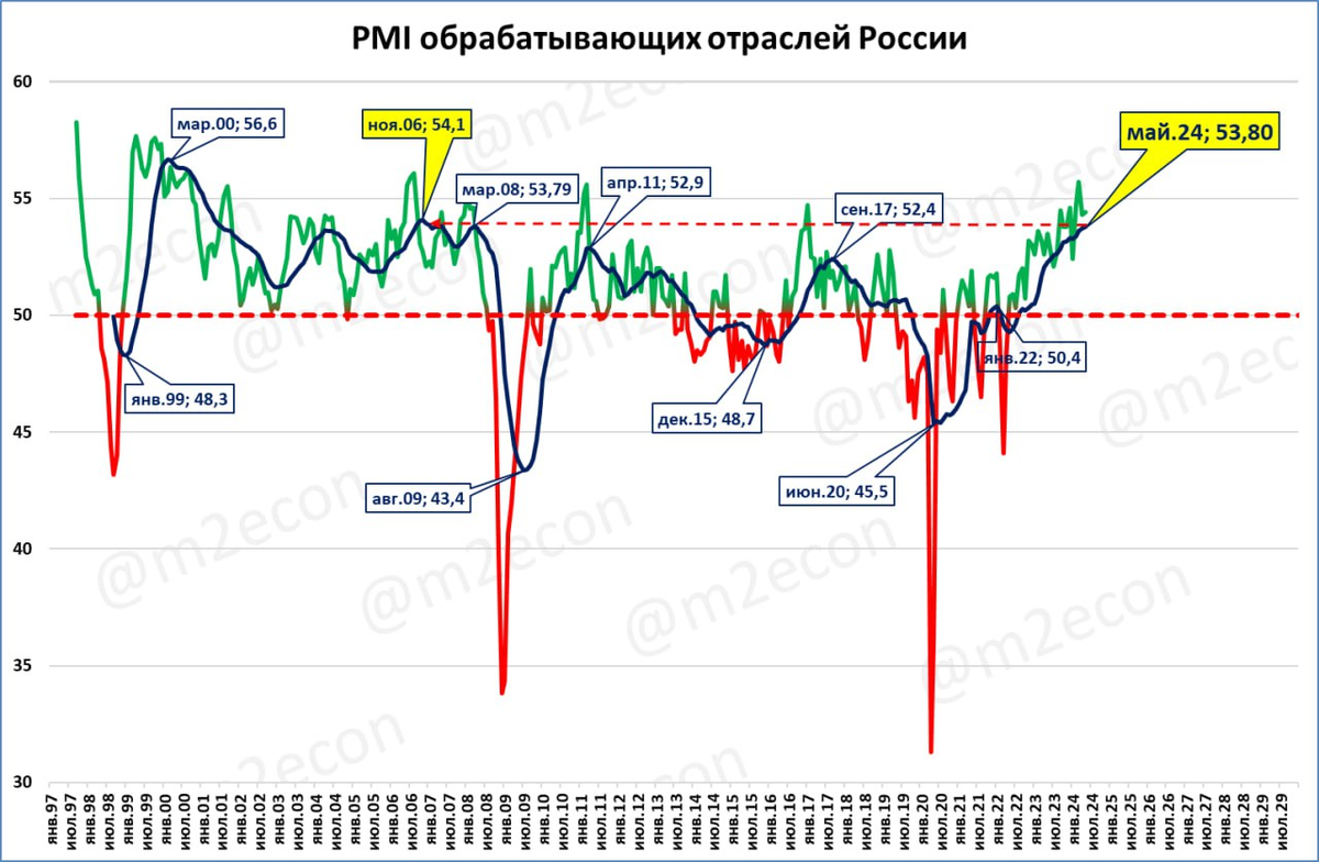 Деловая активность в промышленности в мае растёт, индекс PMI стал рекордным с 2006 года (54,4 пункта).