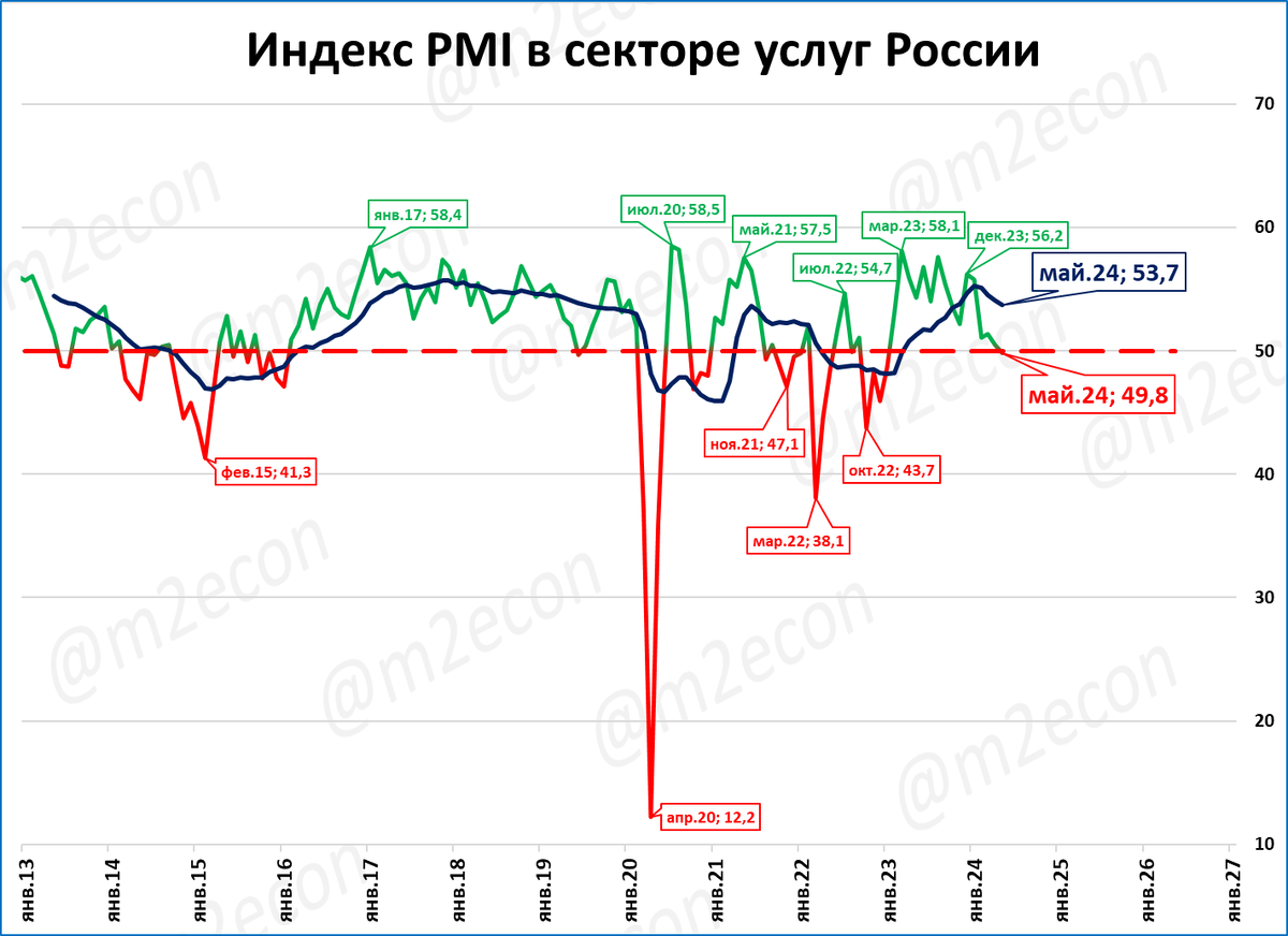 Его динамика больше схожа с индексом в секторе услуг. Это логично: промышленность - это около 30% ВВП (обрабатывающая - ещё меньше). А услуги — это более 60% ВВП.