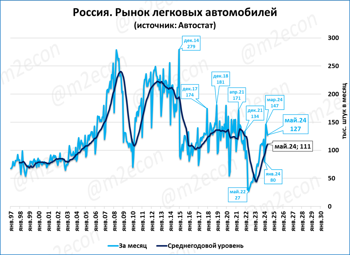 Рынок легковых автомобилей вырос на 76% к маю прошлого года до 127 тыс. штук. Текущий тренд ведёт к 1,7 млн. по итогам года. Это стало бы лучшим результатом за 10 лет.