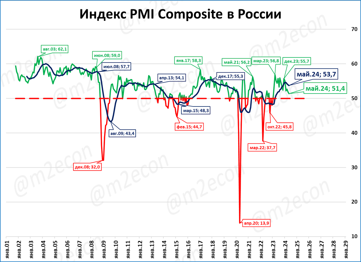Композитный индекс PMI (промышленность + услуги) в мае составил 51,4 пункта.