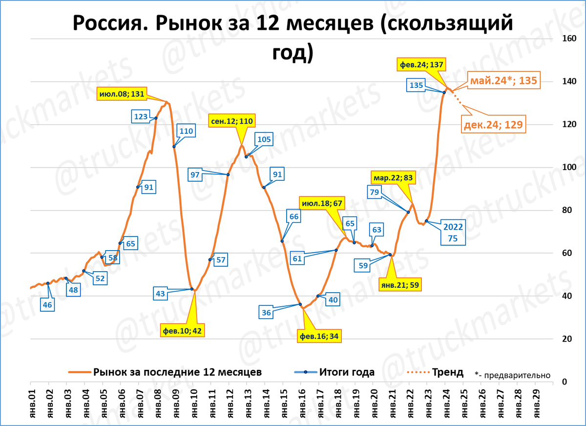 Механическое продление текущего тренда даёт результат 129 тысяч по итогам 2024 года.