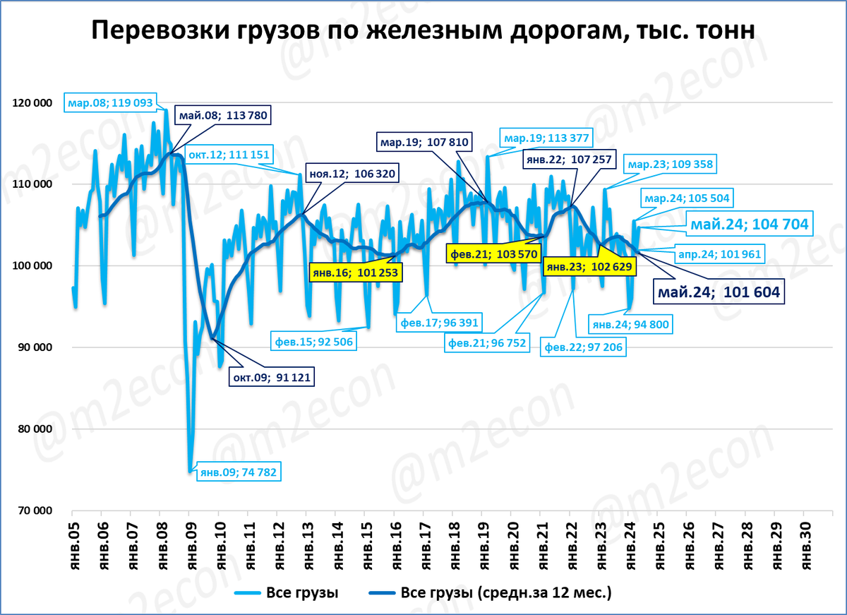 В мае железными дорогами, по нашей предварительной оценке, перевезено 104,7 млн. тонн грузов.
