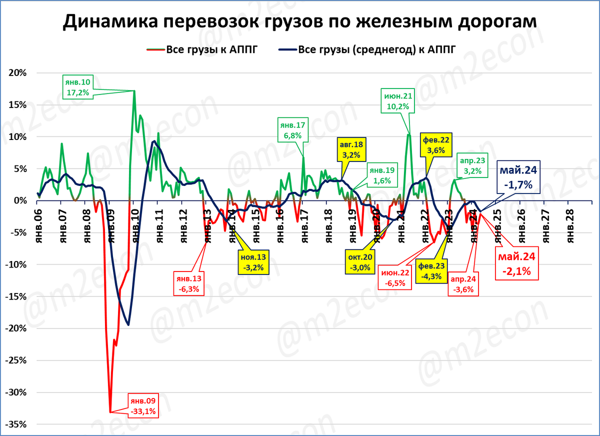 Перевозки за 12 месяцев (скользящий год) приближаются к многолетним минимумам 2016 года.