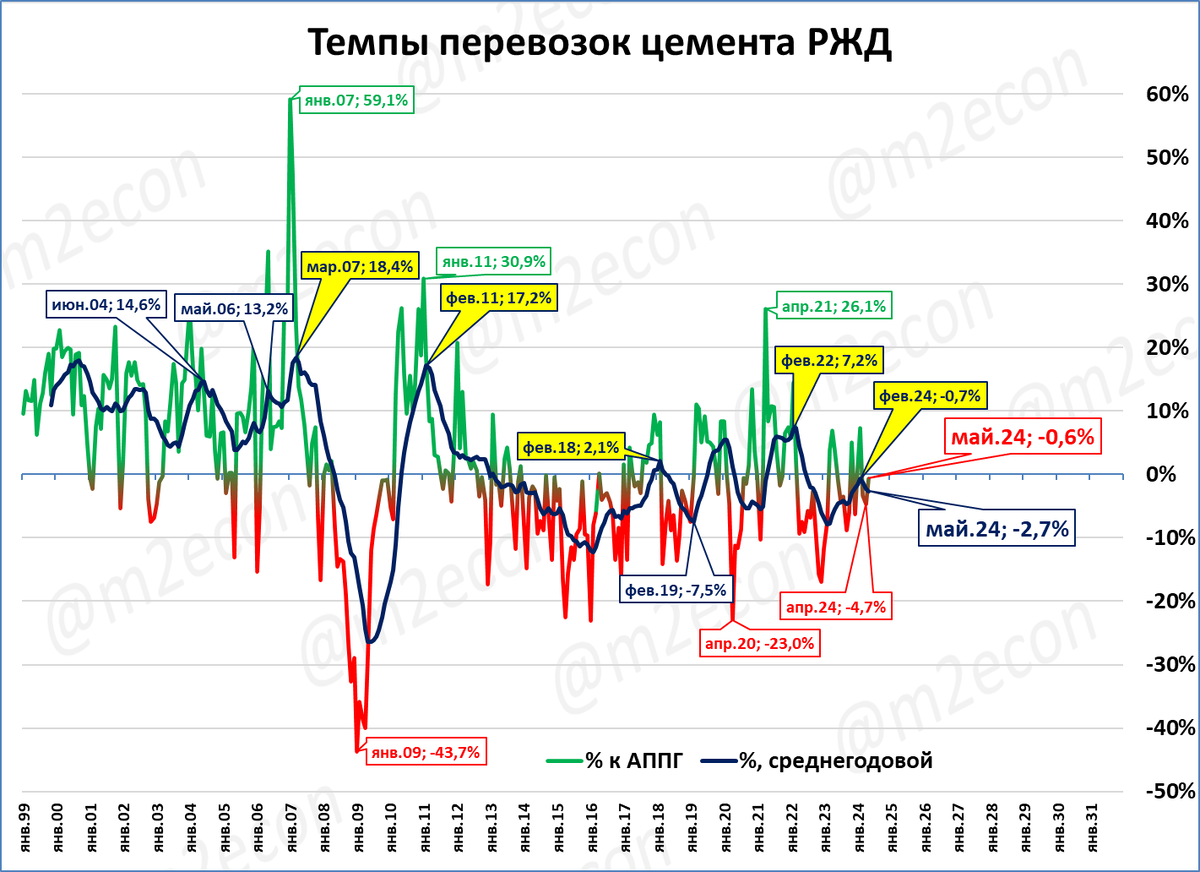 Таким образом, перевозки цемента стабилизировались на уровне 23-летней давности (2001 года).