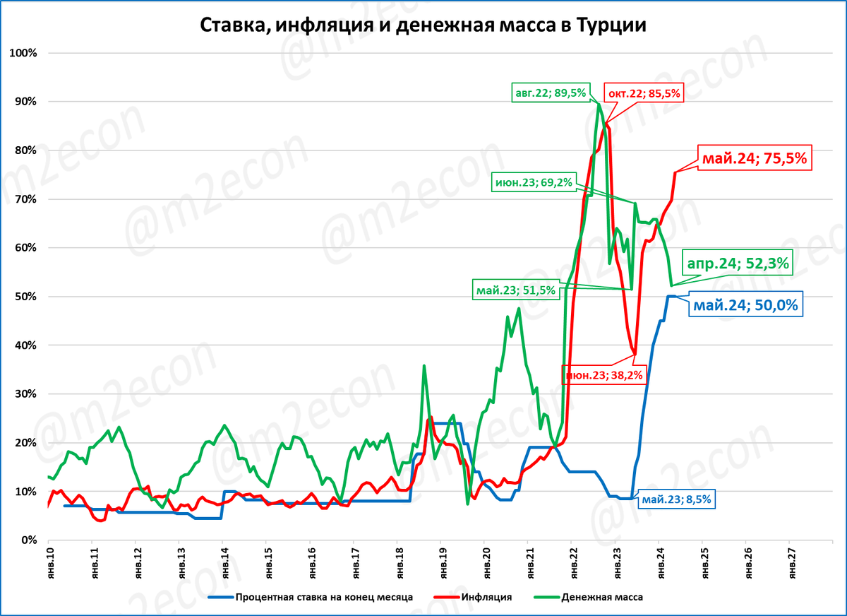 Турция: инфляция в мае составила 75,5%. Темп роста денежного агрегата М2 в номинальном выражении в мае составил 52,3%. В реальном выражении денежная масса упала на 10,3% за год. Падение продолжается уже пятый месяц подряд. На темпах роста ВВП Турции сжатие РДМ пока не сказалось. В первом квартале ВВП вырос на приличные 5,7%.