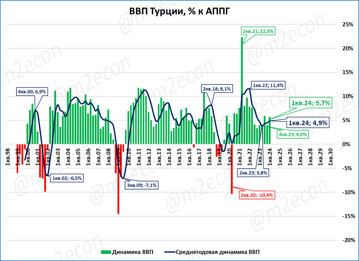 На темпах роста ВВП Турции сжатие РДМ пока не сказалось. В первом квартале ВВП вырос на приличные 5,7%.