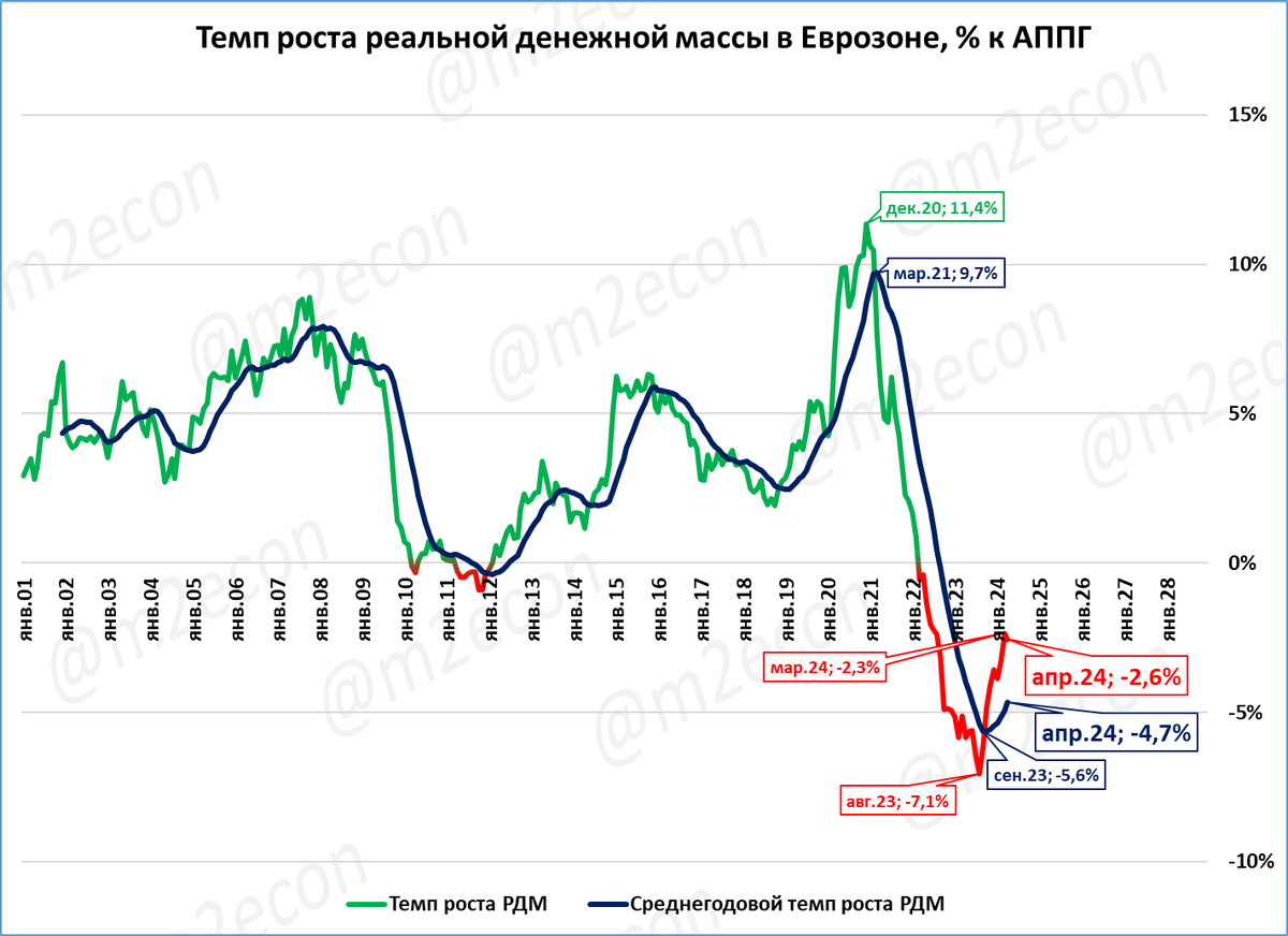 ЕЦБ впервые с 2022 года снизил ставку в Еврозоне с 4,5 до 4,25%. При этом инфляция устойчиво держится выше 2% (2,6% в мае). Номинальное падение денежной массы в марте апреле прекратилось, но реальное – продолжается.