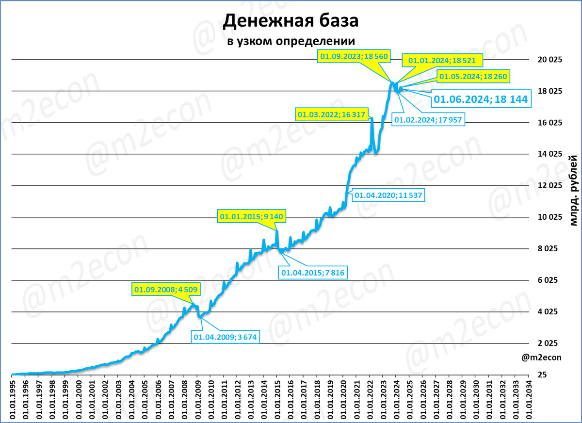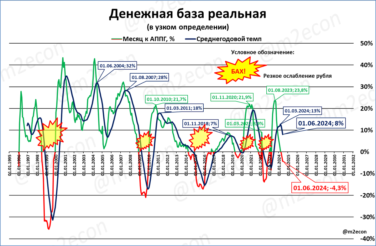 Обратите внимание на любопытную закономерность: все сжатия реальной узкой денежной базы удивительным образом совпадали с кризисами и со случаями резкого ослабления рубля (обозначены на графике вспышками, “бахами”).